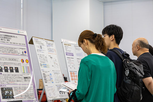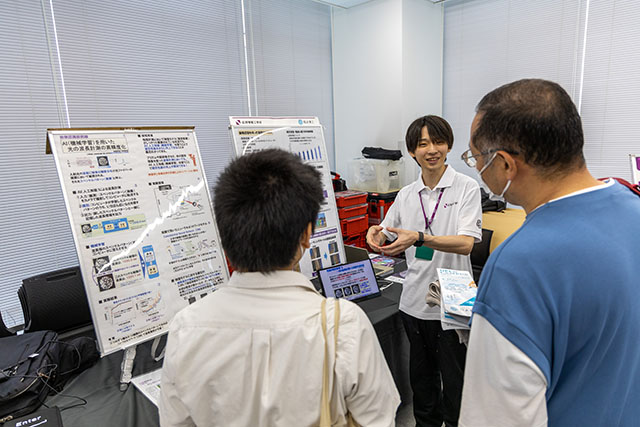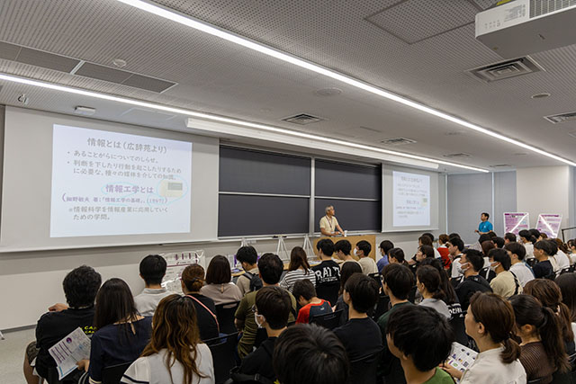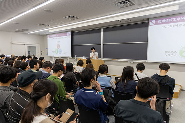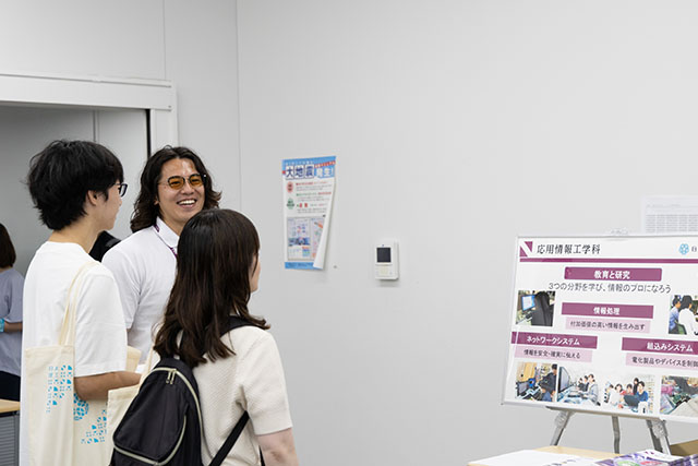 オープンキャンパス駿河台は,理工学部14学科と短期大学部が一堂に会し、学科・入試相談会や学科紹介プログラムなどを実施するイベントです。今回は応用情報工学科の研究室のなかから10研究室が,研究成果となるソフトウェアやポスターを展示しました。現役の4年生や大学院生による展示内容の紹介は多くの高校生に体験してもらうことができました。教室主任である細野教授による学科説明,情報科学専攻2年生による学科紹介および研究紹介が行われ,会場が満員になるほどの盛況ぶりでした。なかでも「学生が語る応用情報工学科の魅力」では,この日のために大学院生が特別に制作した説明用のウェブサイトを活用し,応用情報工学科での学びについてわかりやすく紹介され,多くの来場者から高い関心が寄せられました。
