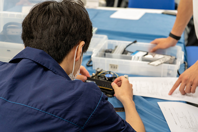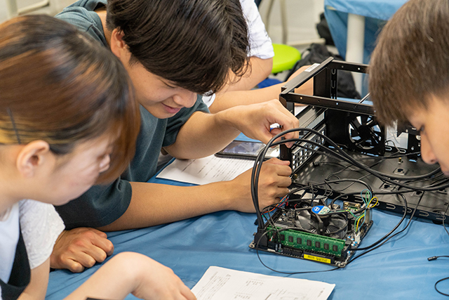2023年7月10日(月),7月24日(月)に,応用情報工学科1年生の授業科目「応用情報工学インセンティブ」の一環としてPC組み立て実習を実施しました。 PC組み立て実習は,7人程度で1班を構成し,班ごとに用意されたパーツを用いて一からPCを組み上げることを体験します。1週目は実際に組み立てる作業を行い,2週目は慣れないBIOSの設定やOSのインストール,プログラミング環境の構築などを体験しました。