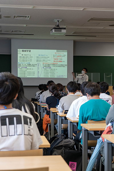 オープンキャンパスでは,応用情報工学科のミニ講義が2件行われました。一つ目は,香取教授から「となりの情報工学」と題して,応用情報工学科での学び,学生生活などについて講義がありました。二つ目は,関助教から「自ら学ぶ機械-AIの思考回路-」と題して,AIの概要や,AIの思考回路が解釈困難であるブラックボックス問題について講義がありました。船橋キャンパスでのオープンキャンパスのため応用情報工学科の多くの学生の協力もあり,14号館に設営したブースには多くの高校生が見え,展示や説明を熱心に見聞きし,体験していました。