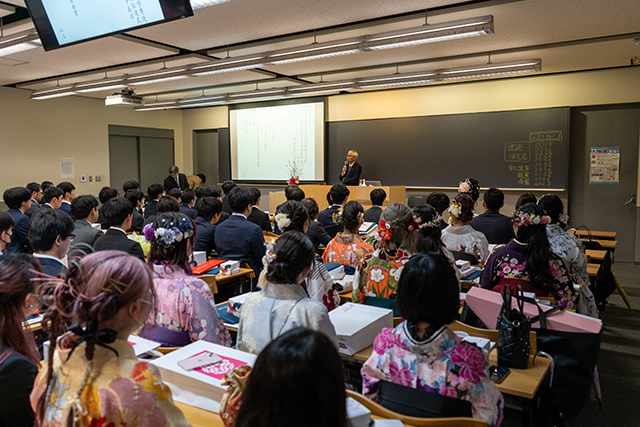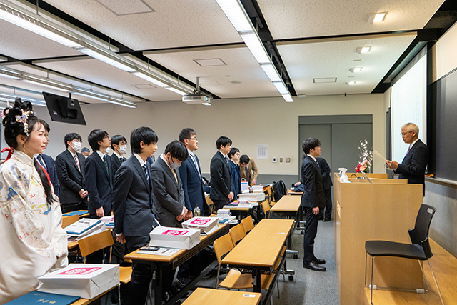 応用情報工学科の学部生99名が卒業,情報科学専攻・博士前期課程の大学院生21名が修了しました。進路は,産業界や官公庁への就職,大学院への進学など多方面にわたっております。教室主任からは,支えてくださった周囲の方,特に保証人の方への感謝を忘れずに,今後も頑張っていくよう激励を込めた告辞が送られました。皆さんのご活躍を期待しています。