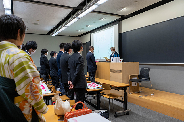 応用情報工学科の学部生107名が卒業,情報科学専攻・博士前期課程の大学院生19名が修了しました。令和4年度の卒業生は学部2年生からの期間を,修了生は2年間の大学院生活を新型コロナウィルス感染症の影響下で過ごした学年になります。卒業生,修了生,各人の創意工夫によりコロナ禍での学業及び研究活動が成されたことと思います。教室主任からは,この時代の経験を今後の糧とし,諦めないで生きていくよう激励を込めた告辞が送られました。皆さんの活躍を期待しています。